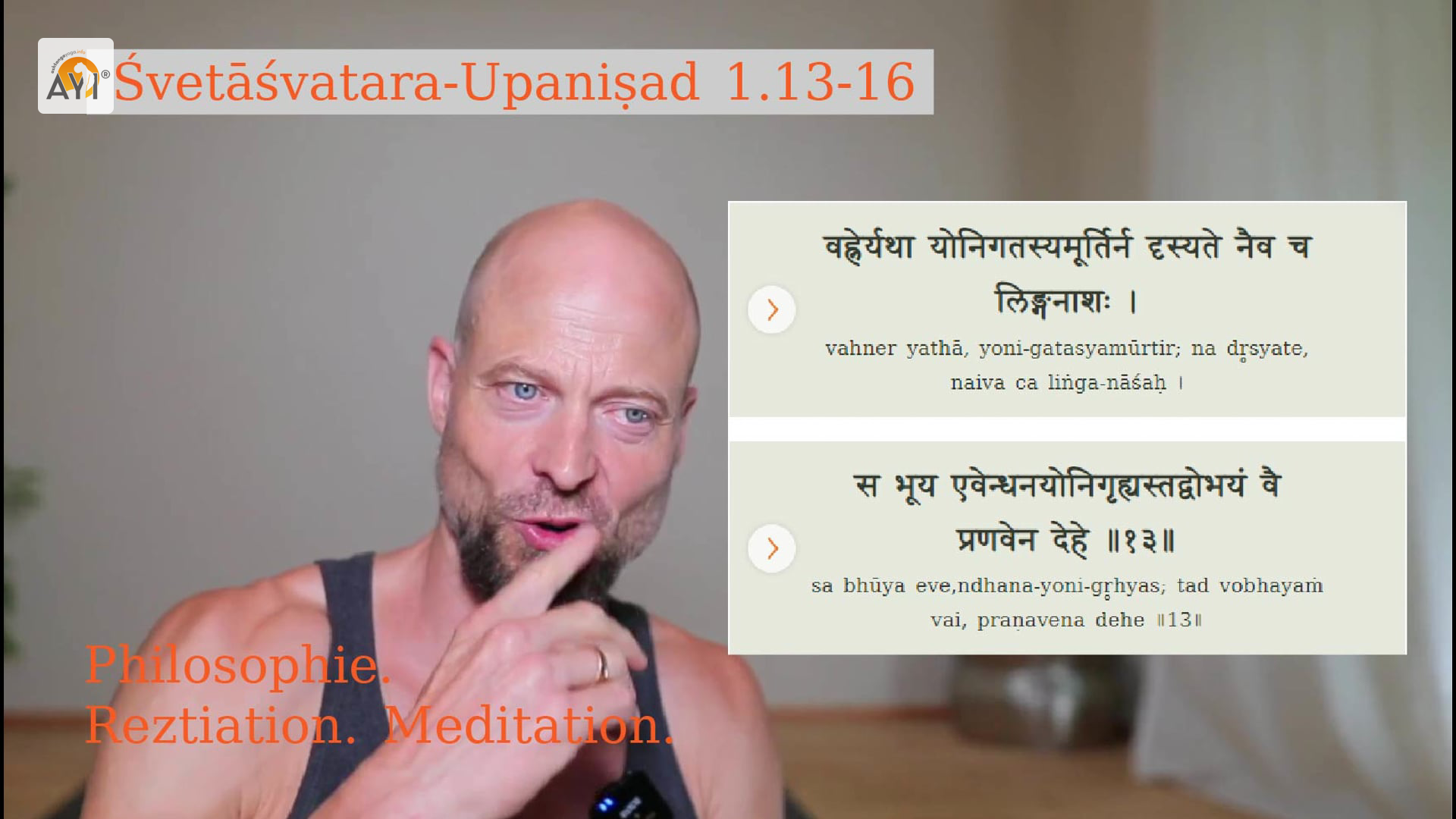 Tauche ein in Yoga-Philosophie, Rezitation und Meditation. Ergründe so die Frage ob Du durch den Laut OM Feuer machen kannst. 20 Minuten der meditativen Betrachtung der Shvetashvatara Upanishad 1.13-16. – Für Anfänger*innen geeignet